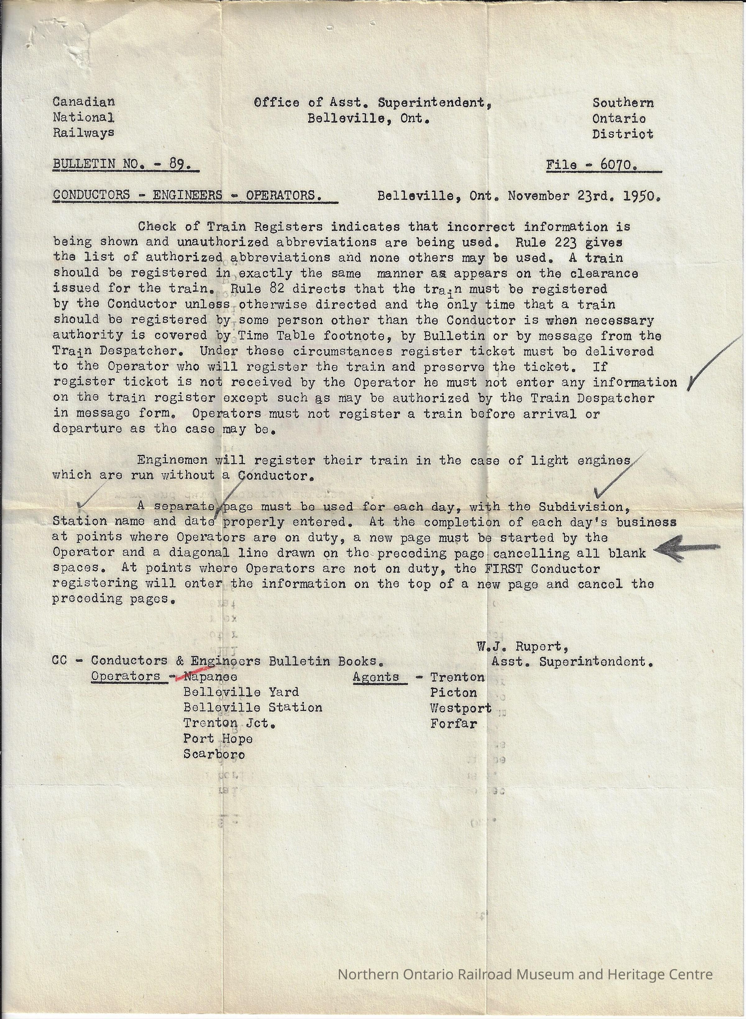 Canadian National Railways - Office of Asst. Superintendent, Belleville, Ontario Bulletin No. 89Entry/Object ID
