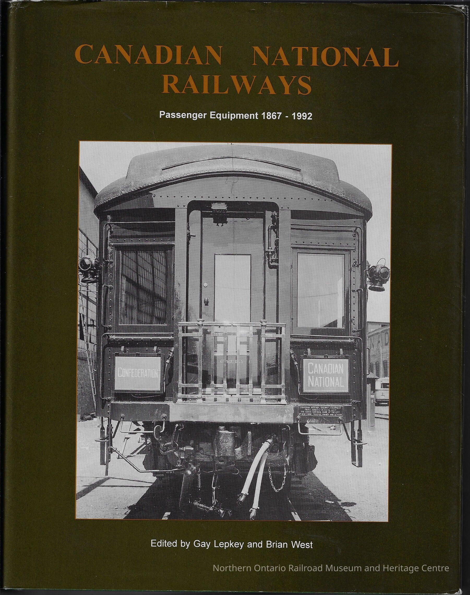 Book detailing the history of Canadian National's passenger equipment used between 1867 and 1992. Contains a roster as well as historical photographs. Hard cover book.