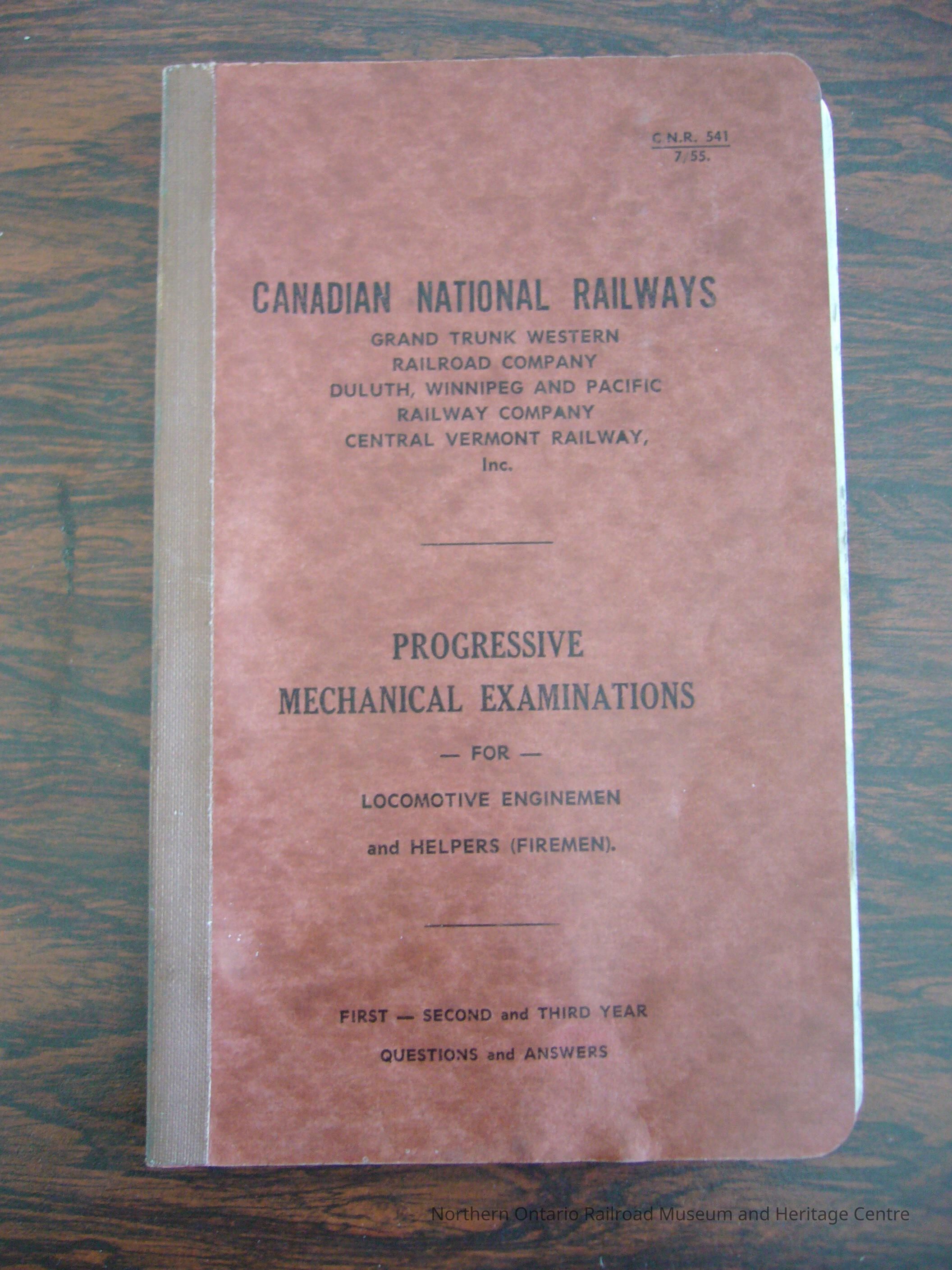 Book, study guide for Canadian National Railways progressive mechanical examinations for locomotive enginemen and helpers (firemen). Includes: questions and answers, first year, introduction, diesel-electric general, air brake general, 24 RL, vapor-clarkson steam generator, injectors, exhaust system injectors, mechanical, mechanical stokers, oil burning, second year, alco-MLW 1500-1600 H.P., GMD-1500-1700 H.P., FM-CLC C. Line-1600 H.P., FM-CLC. 1200 H.P., switcher, air brake-general, 24 RL, steam locomotive-general, feedwater systems, exhaust system Inj, injectors, electrical equipment, lubricators (Mechanical), thermic syphon, third year, diesel-electric general, dynamic braking, alco-MLW-1500-1600 H.P., GMD-1500-1600 H.P., F.M.-CLC C-Line 1600 H.P., FM-CLC 1200 H.P. Rd Switcher, air brake-24 RL, 14 EL, 6 SL and 6 DS, stem locomotive-general, walschaert gear, baker gear, elesco CF-1 pump, exhaust system Inj, Feedwater systems, steam locomotive-lubr (Hydrostatic) (mechanical), general lubrications, reverse gear, sanders, air brakes.