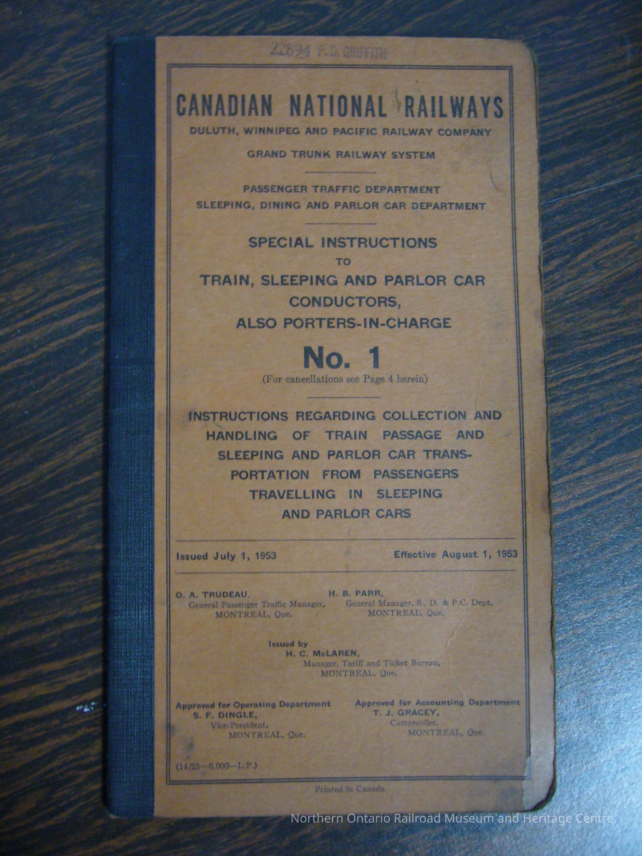 Canadian National Railways Special Instructions to Train, Sleeping and Parlor Car Conductors, Also Porters-In-Charge, No. 1. Instructions regarding collection and handling of train passage and sleeping and parlor car transportation from passengers travelling in sleeping and parlor cars. Effective August 1, 1953.