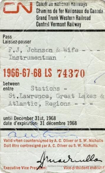 Original document belonging to Fred Johnson. The pass allowed Johnson and his wife to travel on any passenger train throughout the St. Lawrence, Great Lakes, and Atlantic Regions between 1966 and 1968. Fred Johnson was working as an instrumentman at the time.