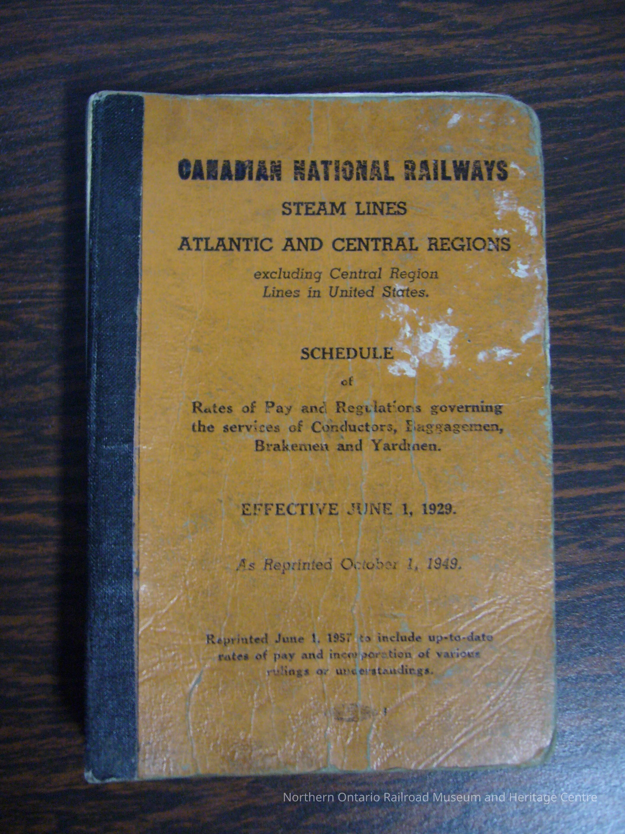 Canadian National Railways Steam Lines, Atlantic and Central Regions Schedule of Rates of Pay and Regulations Governing the Services of Conductors, Baggagemen, Brakemen and Yardmen, Effective June 1, 1929. As reprinted October 1, 1949. Reprinted June 1, 1957 to include up-to-date rates of pay and incorporation of various rulings or understandings.Collection