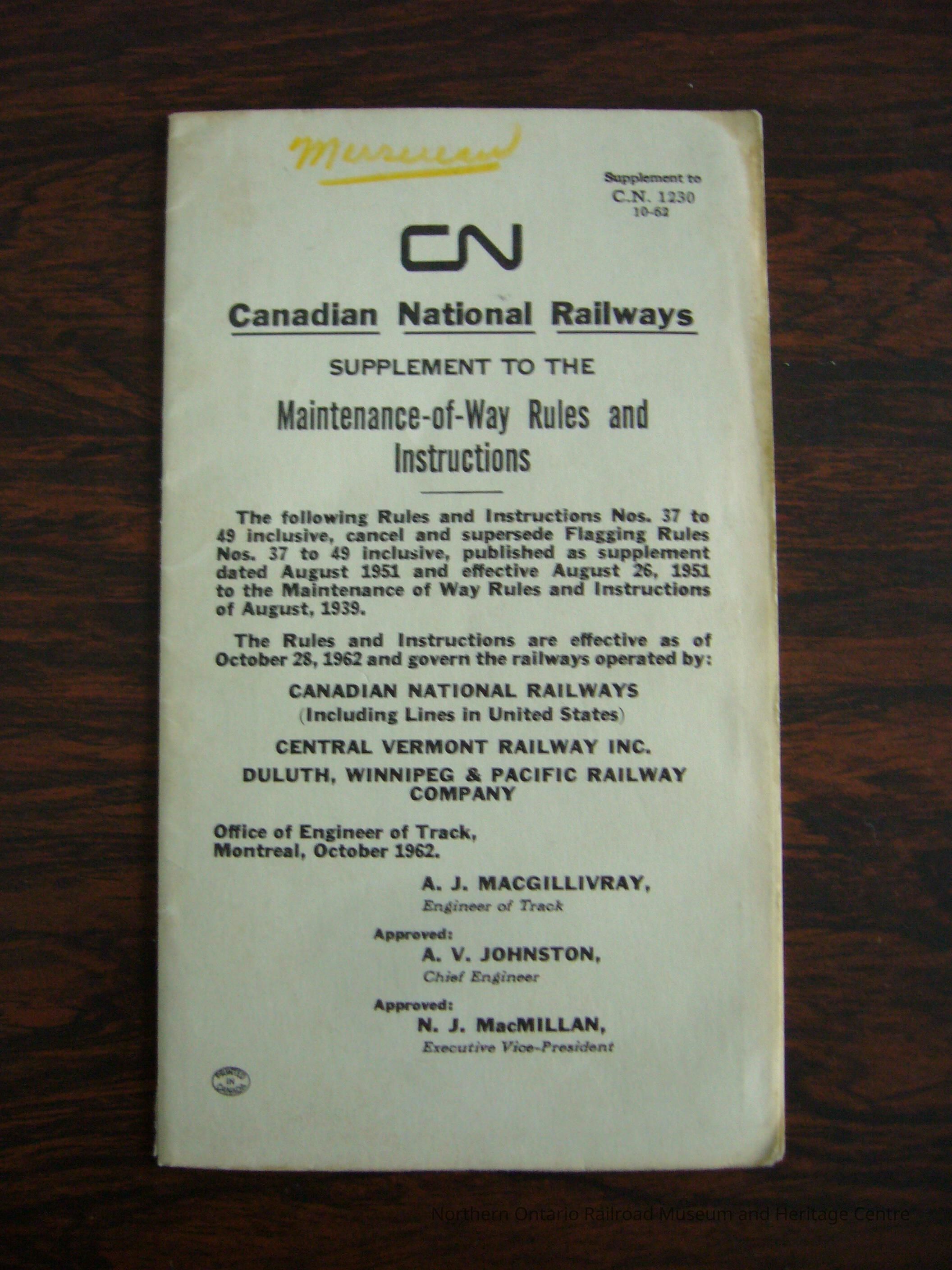 Canadian National Railways supplement to the Maintenance-Of-Way rules and instructions. Supplement to C.N. 1230. The rules and instructions are effective as of October 28, 1962 and govern the railways operated by: Canadian National Railways (including lines in United States), Central Vermont Railway Inc., Duluth, Winnipeg & Pacific Railway Company.Collection