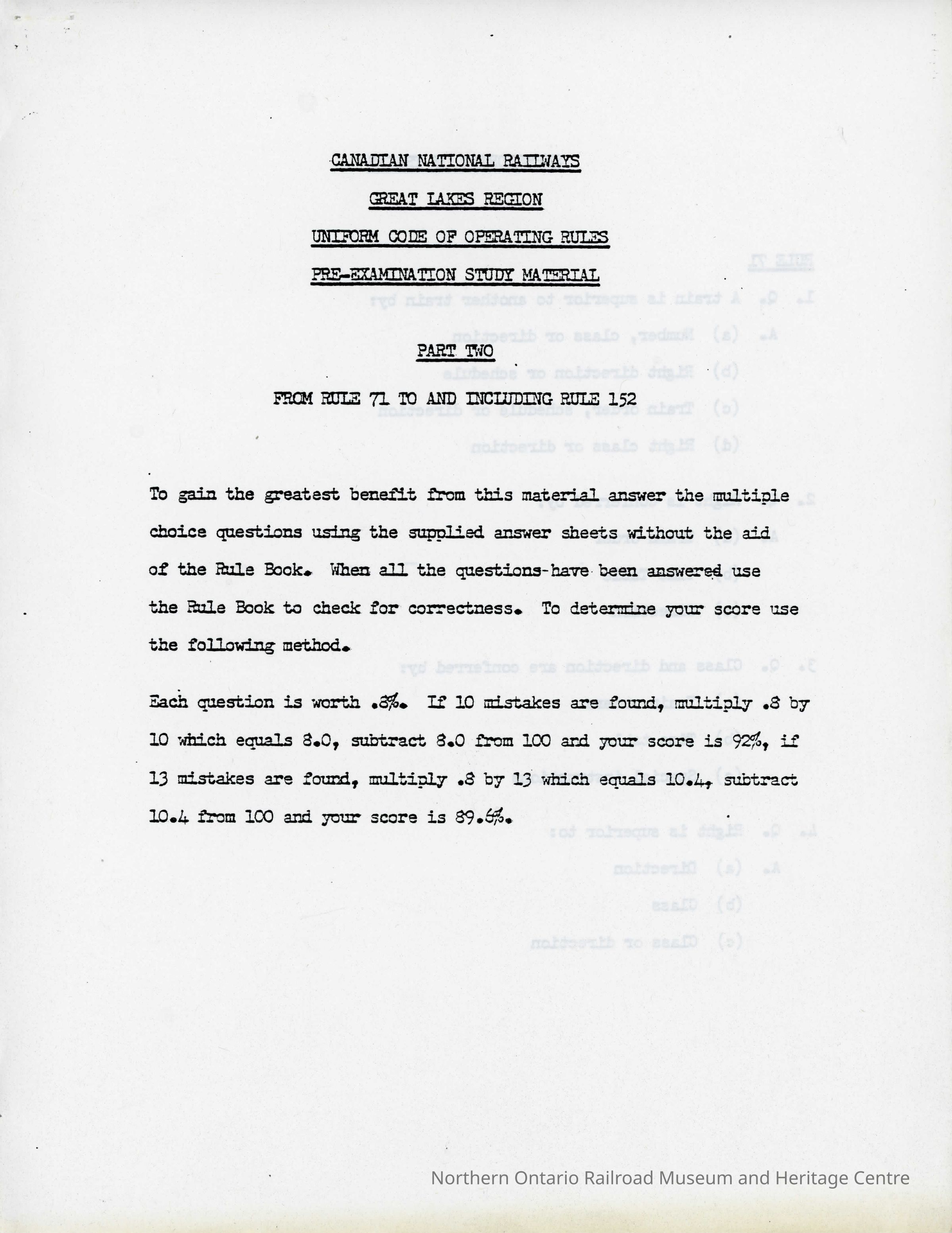 Canadian National Railways Great Lakes Region Uniform Code of Operating Rules Pre- Examination Studey Material, Part Two From Rule 71 and Including Rule 152Collection