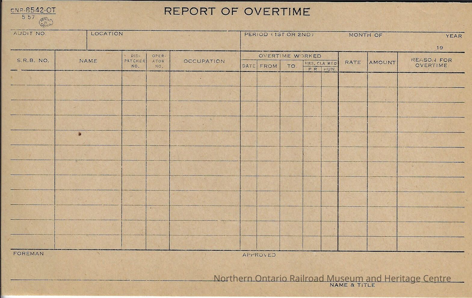 Form, report of overtime for working employees. The form is blank however it has areas to include the following: location, audit number, period, month, year, SRB number, name, dispatcher number, operator number, occupation, overtime worked: date, from, to, hours claimed, rate, amount, reason for overtime, foreman, signature, name and title.