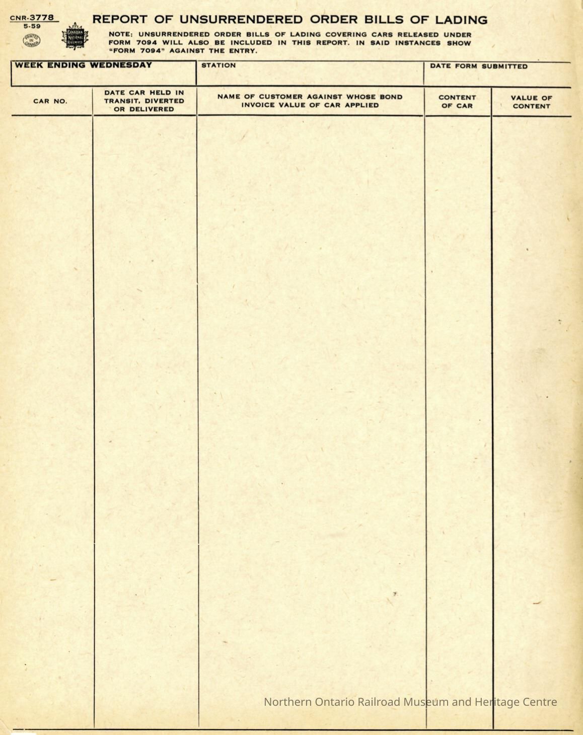 Form, report of unsurrendered order bills of lading. The form is blank however it includes the areas to record: week ending Wednesday, station, date form was submitted, car number, date car was held in transit diverted or delivered, name of the customer against whose bond invoice value of car applied, content of car, value of content.