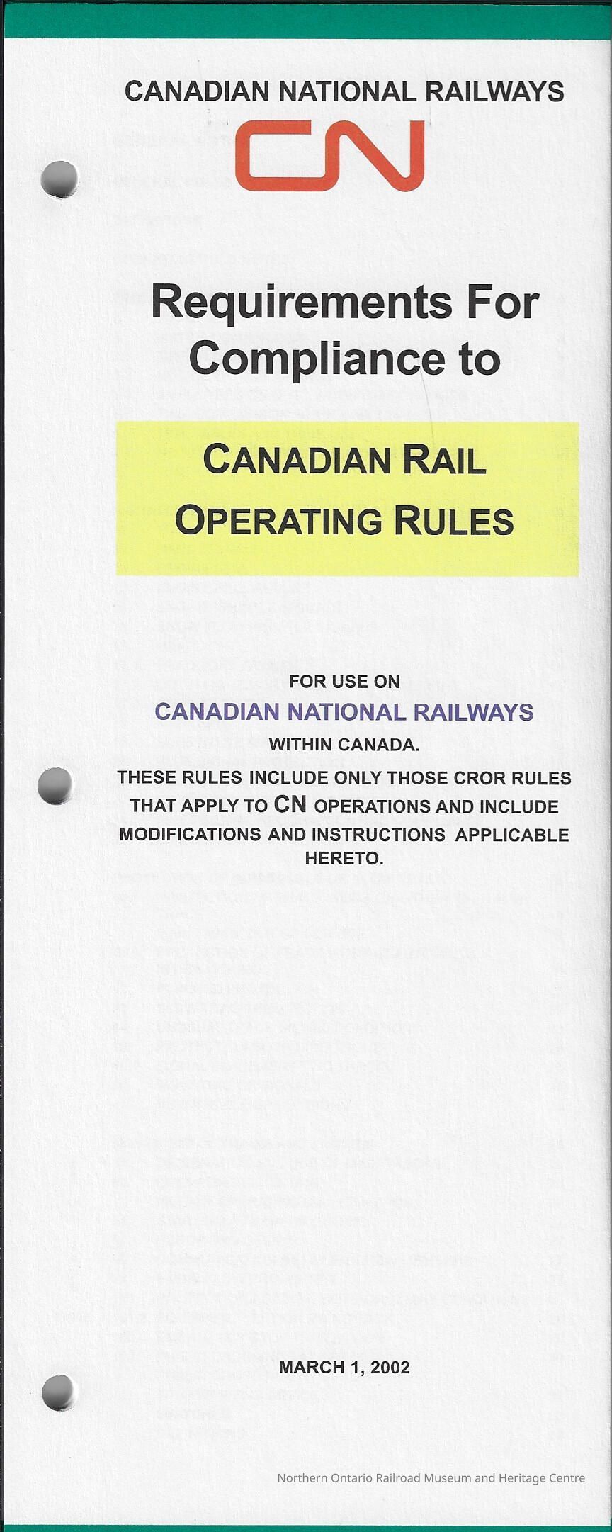 Booklet outlining the requirements for compliance to Canadian rail operating rules. The booklet was printed and used by Canadian National for use on their railways in Canada. It covers: general rules, definitions, time and time tables, signals general, protection of impassable or slow track, movement of trains and engines, radio, general procedures, general bulletin orders, occupancy control system rules, general description and location of fixed signals, block and interlocking signals, centralized traffic control system, interlocking rules.