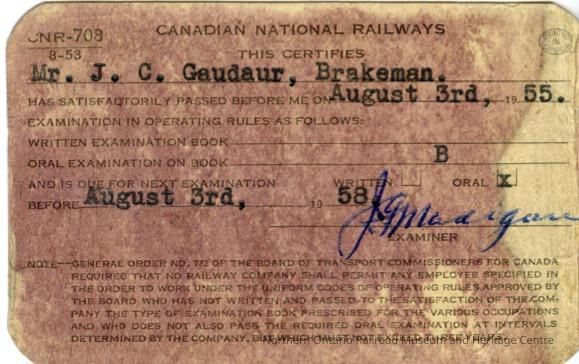 Canadian National: Rules and Examination Certificate, Issued to J. C. Gaudaur, 1955Entry/Object ID