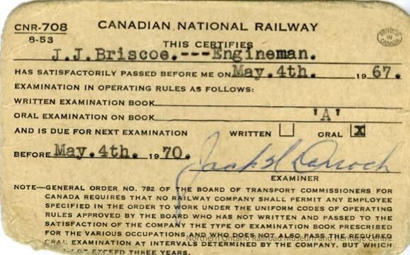 Canadian National: Rules Examination Certificate, J. J. Briscoe, 1967Entry/Object ID