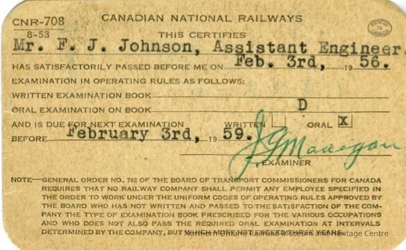 Canadian National branded rules instruction examination certificate. The certificate was issued to F. J. Johnson, an assistant engineer on February 3rd, 1956. The certificate meant that Johnson passed his examination on rules, specifically an oral examination on book D.