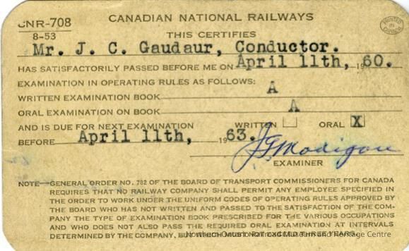 Canadian National branded rules examination certificate. The certificate was awarded to J. C. (Joseph) Gauduar, a conductor for passing his oral examination on operating rules in book "A", on April 11th, 1960. He was examined by J. Madigan.