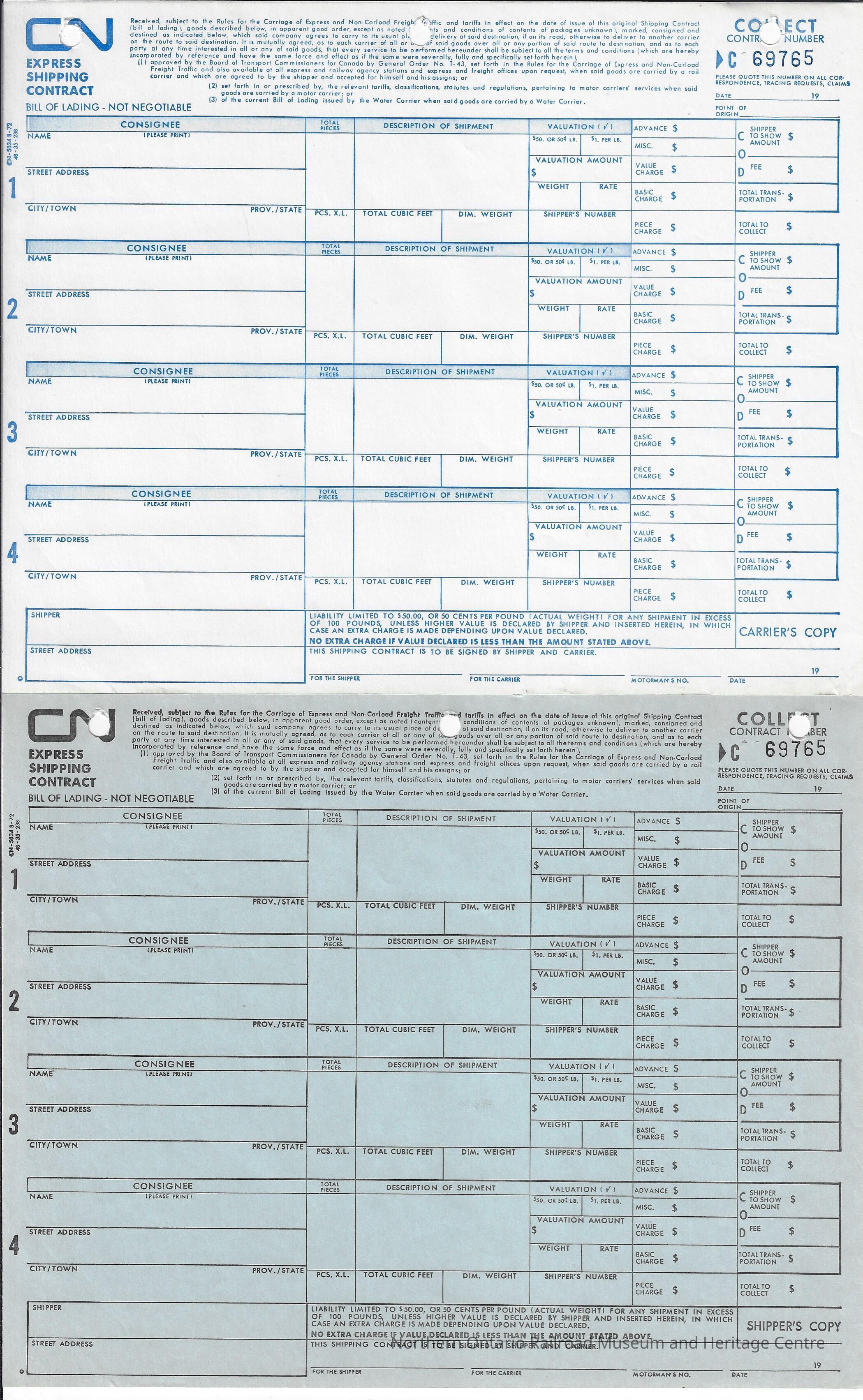 Two copies of a Canadian National express shipping contract bill of lading form. The blue copy was sent to the shipper and the white was the carrier's copy. The form is blank however it includes the spaces to record: name of consignee, address of consignee, description of shipment, total pieces, total cubic feet, weight, valuation, valuation amount, weight, rate, shipper's number, advance payment, miscellaneous charges, value charge, basic charge, piece charge, shipper to show amount, fee, total, COD, shipper signature, carrier signature, motorman's number, date. There are four sections for consignees to fill out shipment orders.