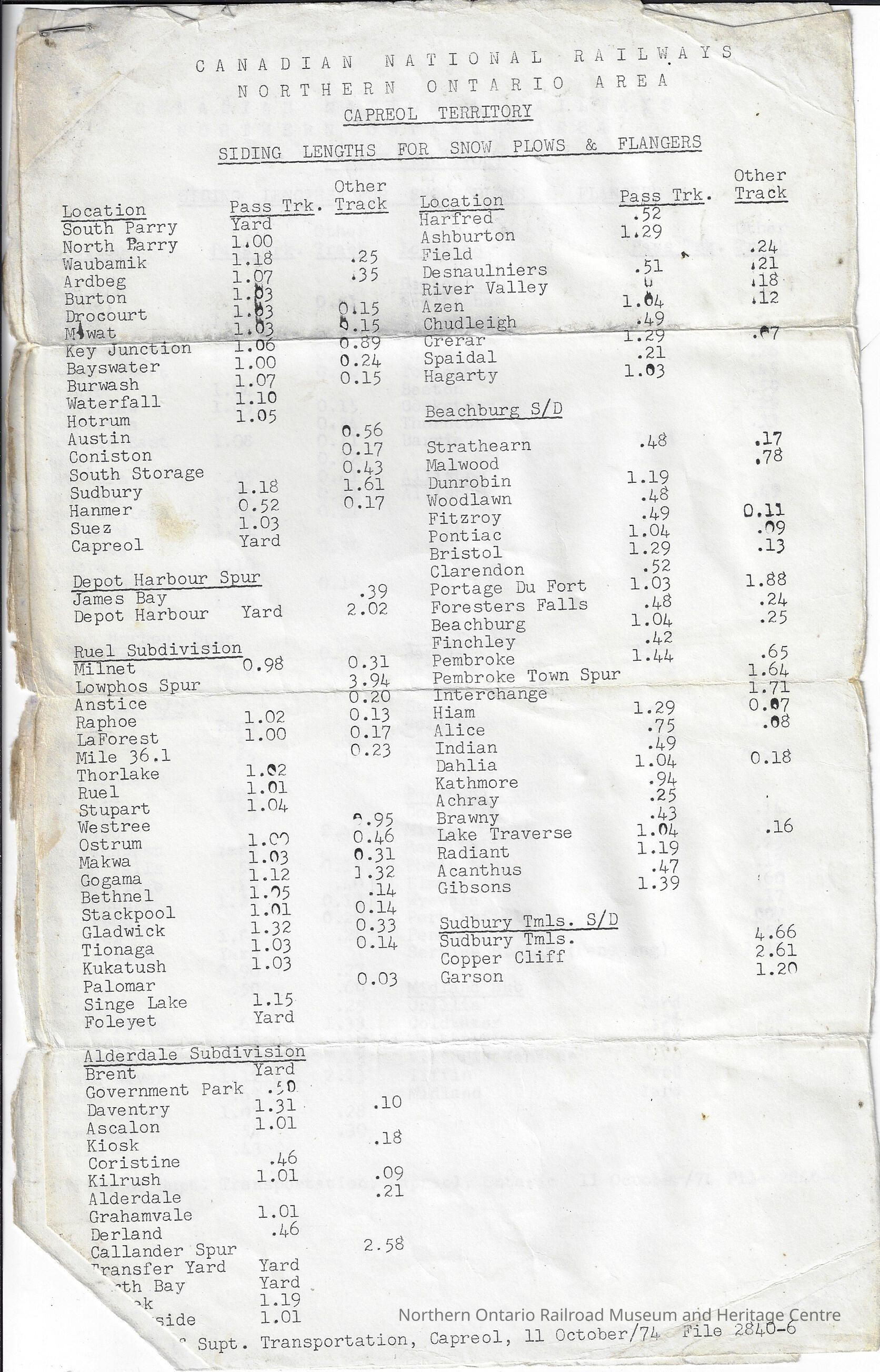 Original document created by the office of the superintendent of transportation for Canadian National showcasing the siding lengths for snow plows and flangers.