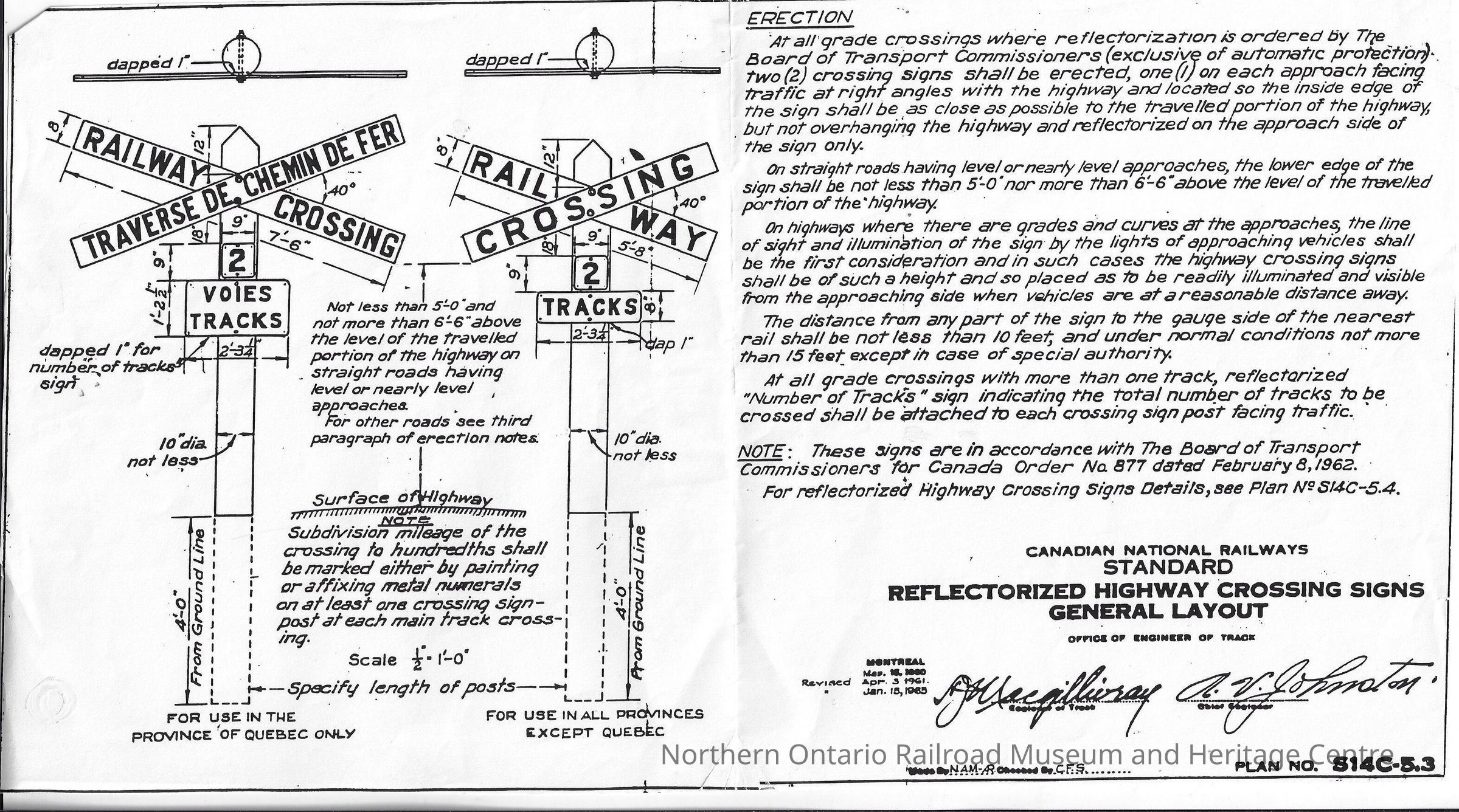 Diagram showing the general layout for Canadian National standard reflectorized highway crossing signs. It provides a diagram for the signs in both English and French with measurements as well as what goes where. There are also written instruction on how and where to erect highway crossing signs.