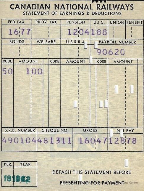 The employee who received this statement is unknown, however it was given to them in 1962. It was used to record the earnings and deductions for Canadian National employee's pay cheques.