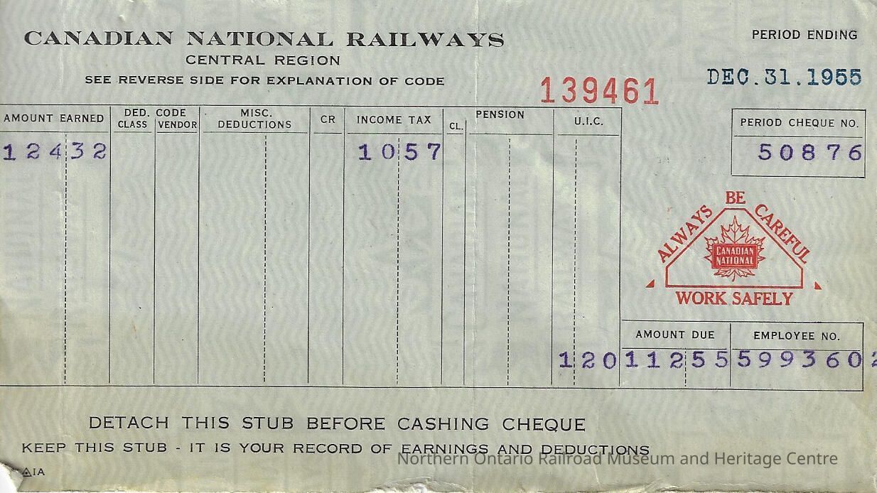 Canadian National branded statement of earnings and deductions belonging to Frank Mazzuca for the pay period ending on December 31, 1955Creator