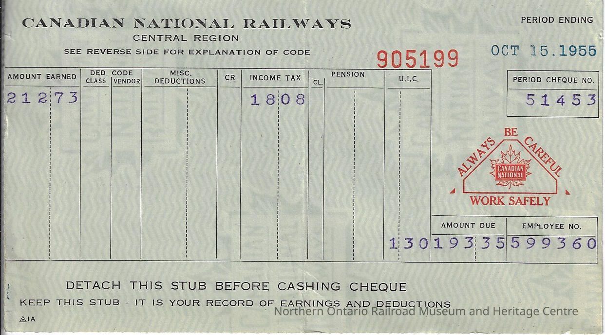 Canadian National branded statement of earnings and deductions belonging to Frank Mazzuca for the pay period ending on October 15, 1955Creator