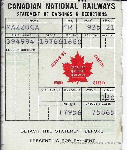 Canadian National branded statement of earnings and deductions belonging to Frank MazzucaContext