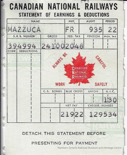Canadian National branded statement of earnings and deductions belonging to Frank MazzucaContext