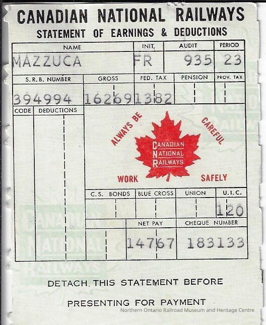 Canadian National branded statement of earnings and deductions belonging to Frank MazzucaContext