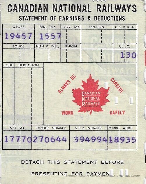 Canadian National branded statement of earnings and deductions belonging to Frank Mazzuca. The year is unknown, circa 1950sContext