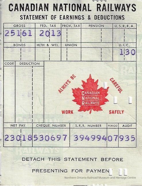 Canadian National branded statement of earnings and deductions belonging to Frank Mazzuca. The year is unknown, circa 1950sContext