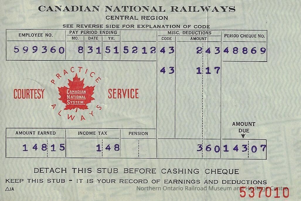 Canadian National branded statement of earnings and deductions belonging to Frank Mazzuca for the pay period ending on August 31, 1951Context