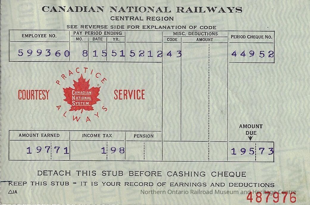 Canadian National branded statement of earnings and deductions belonging to Frank Mazzuca for the pay period ending on August 15, 1951Creator