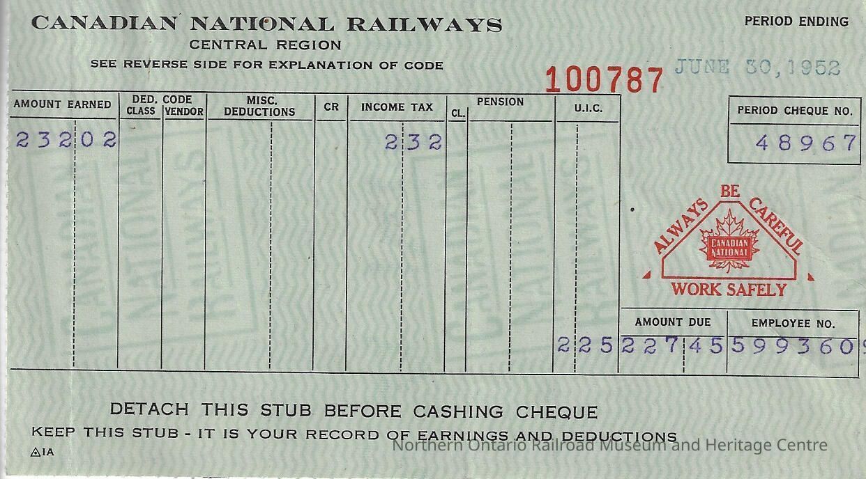 Canadian National branded statement of earnings and deductions belonging to Frank Mazzuca, for the pay period ending on June 30, 1952Creator