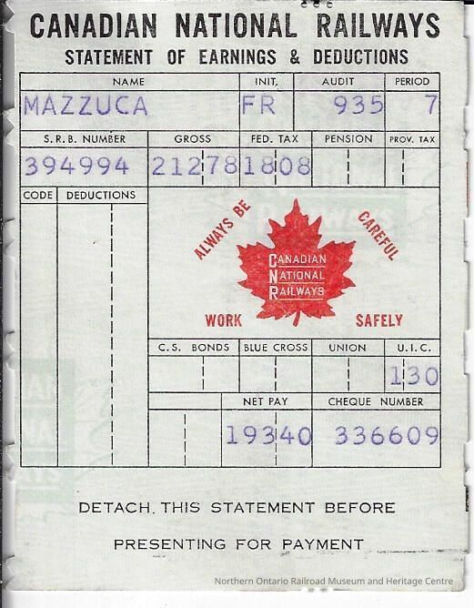 Canadian National branded statement of earnings and deductions belonging to Frank MazzucaContext
