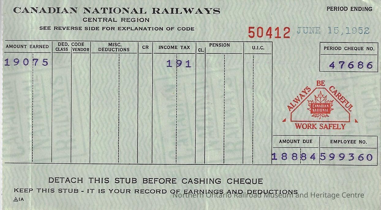 Canadian National branded statement of earnings and deductions belonging to Frank Mazzuca, for the pay period ending on June 15, 1952Creator