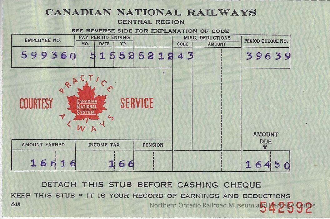 Canadian National branded statement of earnings and deductions belonging to Frank Mazzuca for the pay period ending on May 15, 1952Creator