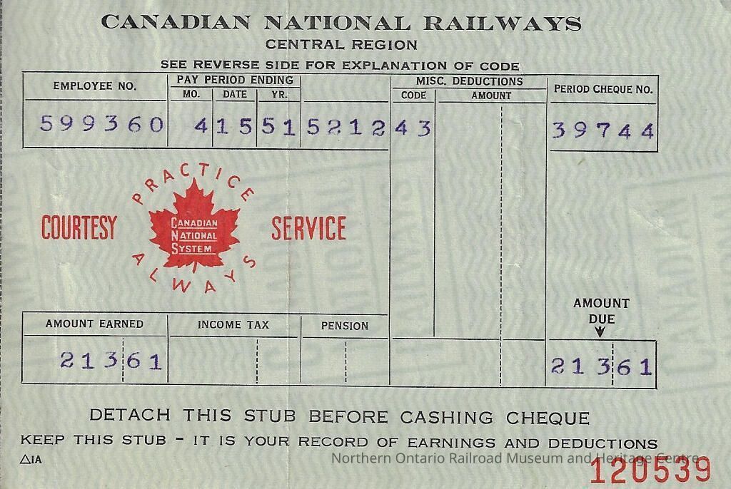 Canadian National branded statement of earnings and deductions belonging to Frank Mazzuca, for the pay period ending on April 15, 1951Context