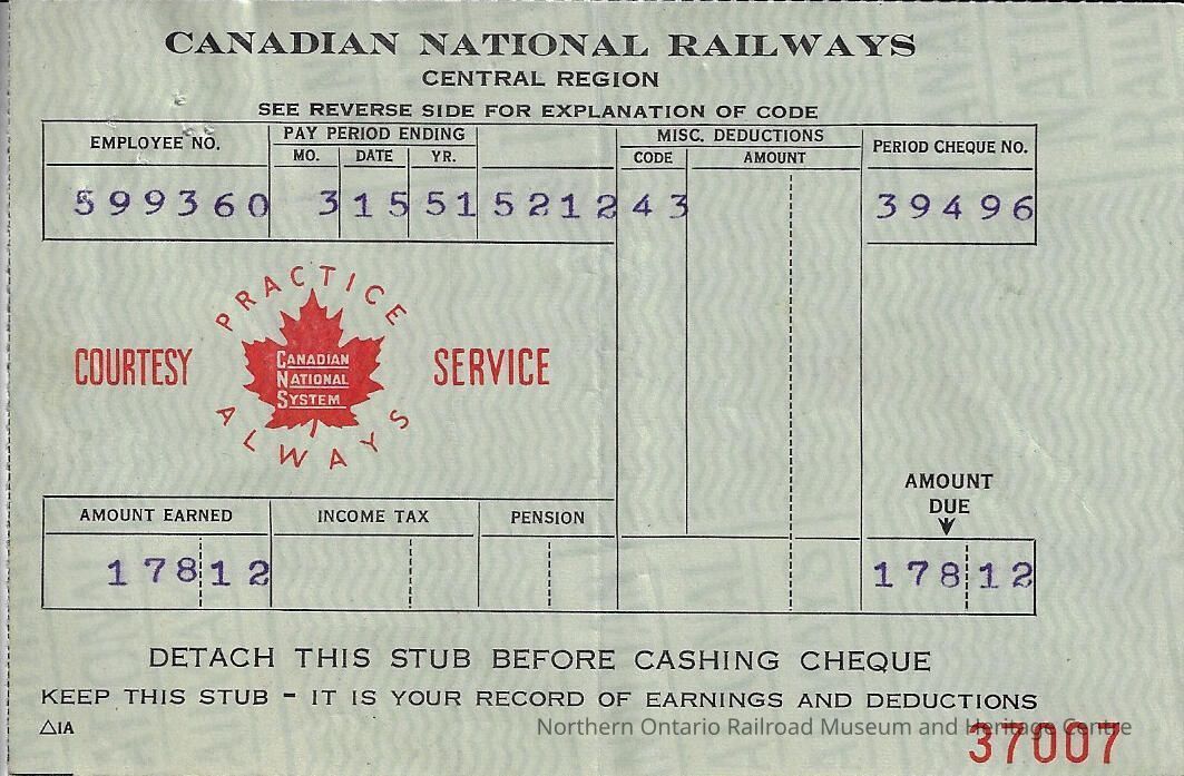 Canadian National branded statement of earnings and deductions belonging to Frank Mazzuca, for the pay period ending on March 15, 1951Context