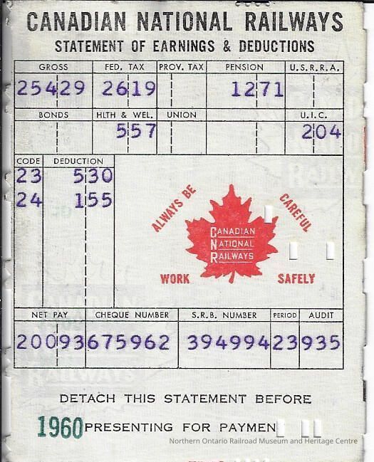 Canadian National branded statement of earnings and deductions belonging to Frank Mazzuca, the exact year is unknown however it was issued for a pay period during the 1960 year.Context