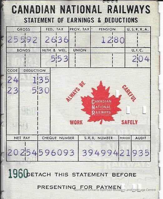 Canadian National branded statement of earnings and deductions belonging to Frank Mazzuca, the exact date is unknown, however it was issued for a pay period during the 1960 year.Context