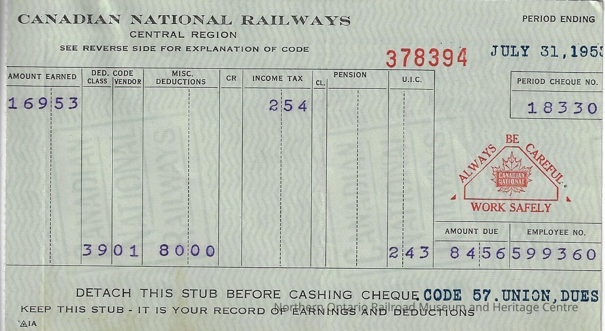 Canadian National branded statement of earnings and deductions belonging to Frank Mazzuca, for the pay period ending on July 31, 1953Context