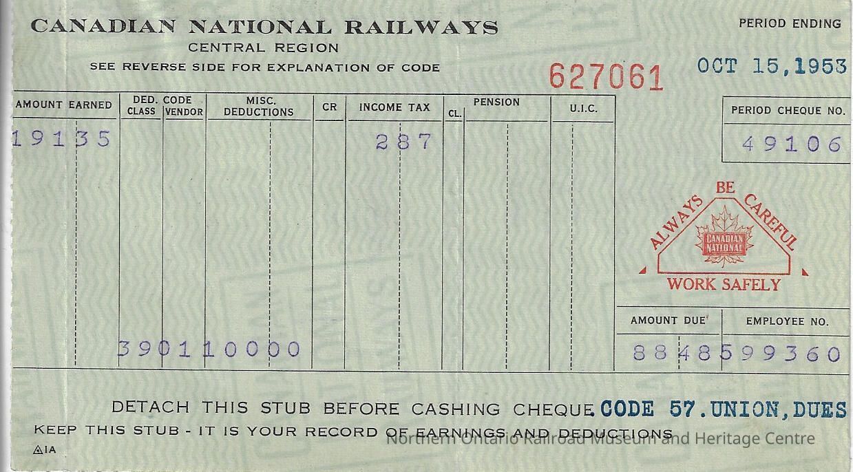 Canadian National branded statement of earnings and deductions belonging to Frank Mazzuca for the period ending on October 15, 1953Creator