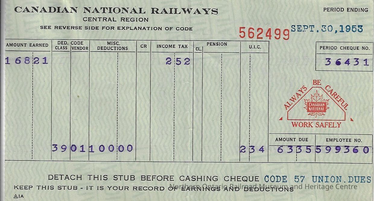 Canadian National Statement of Earnings and Deductions belonging to Frank MazzucaEntry/Object ID