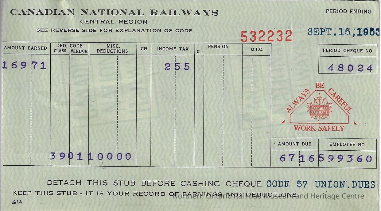 Canadian National branded statement of earnings and deductions belonging to Frank Mazzuca, for the pay period ending on September 15, 1953Creator