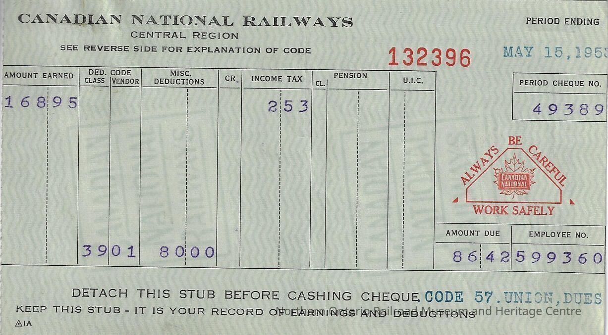 Canadian National branded statement of earnings and deductions belonging to Frank Mazzuca, for the pay period ending on May 15, 1953Context