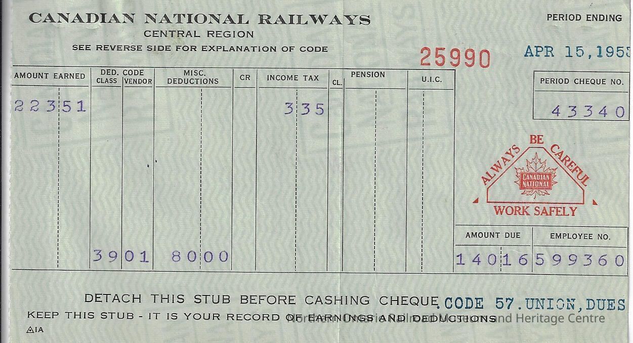 Canadian National branded statement of earnings and deductions belonging to Frank Mazzuca, for the pay period ending on April 15, 1953Creator