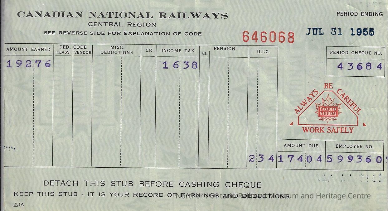 Canadian National branded statement of earnings and deductions belonging to Frank Mazzuca, for the pay period ending on July 31, 1955Creator