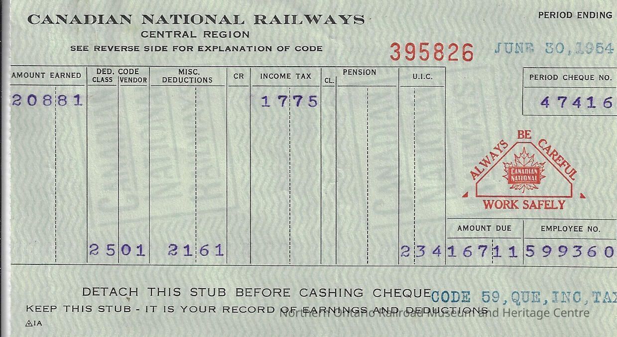 Canadian National branded statement of earnings and deductions belonging to Frank Mazzuca for the pay period ending on June 30, 1954.Creator