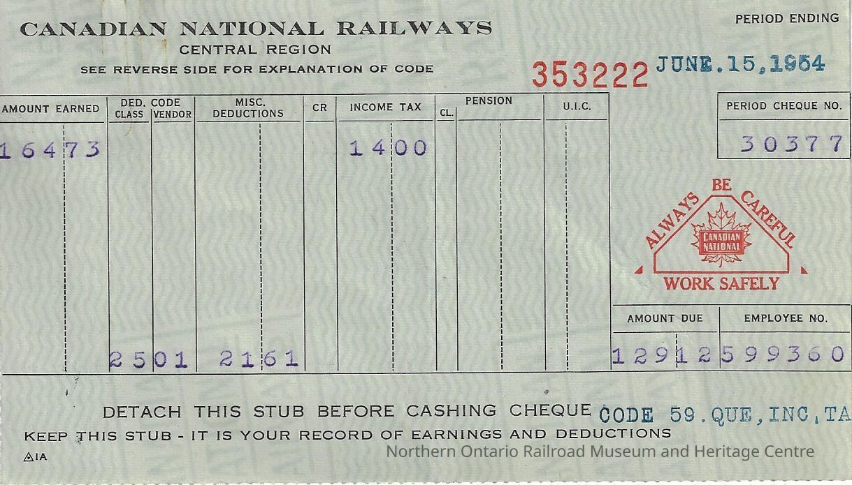 Canadian National branded statement of earnings and deductions belonging to Frank Mazzuca for the pay period ending on June 15, 1954Creator
