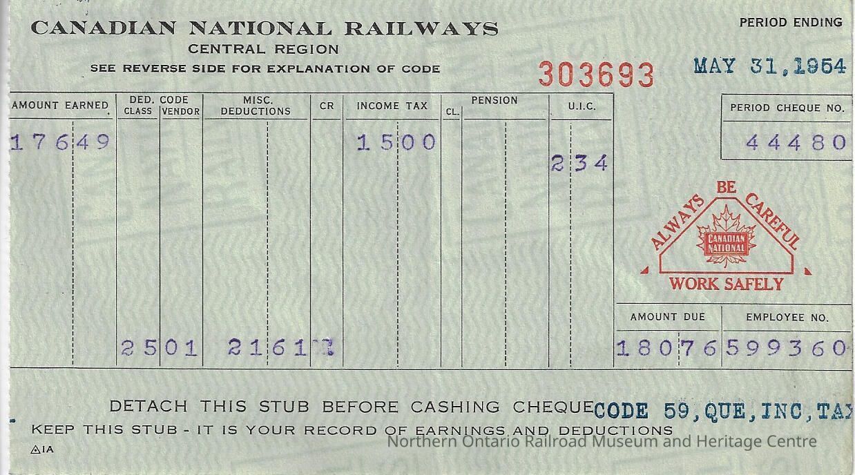 Canadian National branded statement of earnings and deductions belonging to Frank Mazzuca, for the pay period ending on May 31, 1954Creator