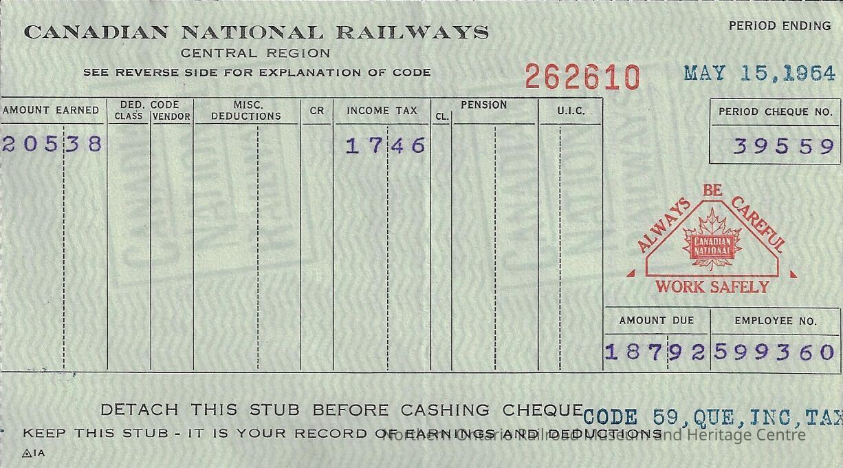 Canadian National branded statement of earning and deductions belonging to Frank Mazzuca for the pay period ending on May 15, 1954Creator