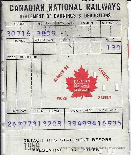 Canadian National branded statement of earnings and deductions belonging to Frank Mazzuca, the exact date is unknown, however it was issued during a pay period in the 1959 year.Context