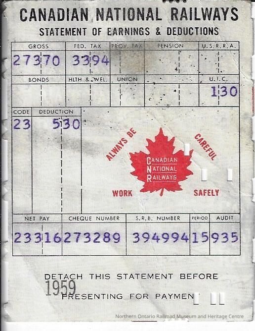 Canadian National branded statement of earnings and deductions belonging to Frank Mazzuca, the exact date is unknown, however it was issued for a pay period during the 1959 year.Context