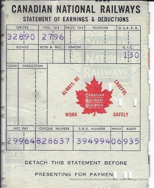 Canadian National branded statement of earnings and deductions belonging to Frank Mazzuca, the exact date is unknown, however it was issued for a pay period during the 1959 yearContext